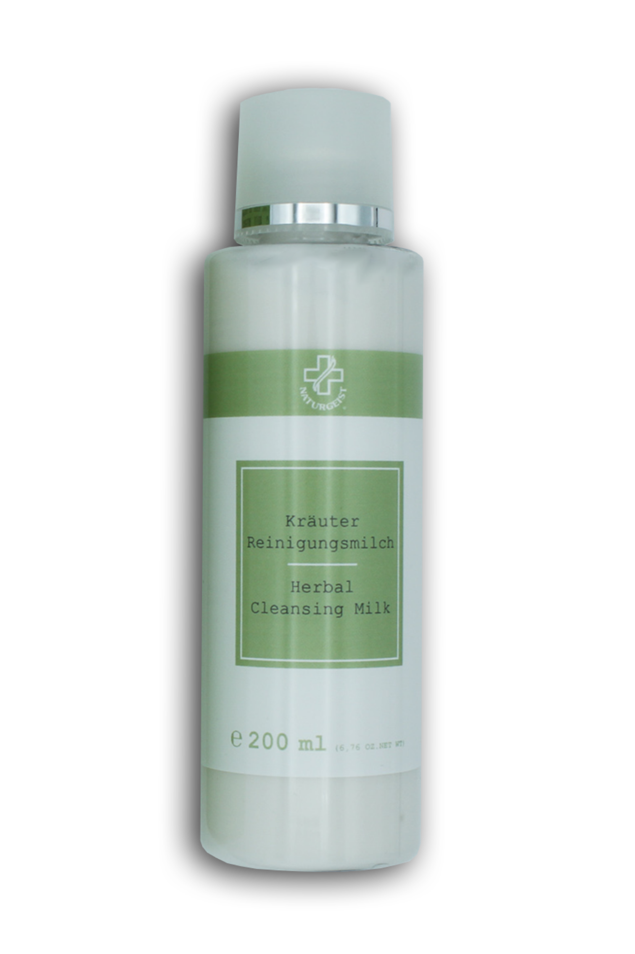 Le lait nettoyant aux herbes possède d'excellentes propriétés dissolvantes et se compose d'huile d'avocat, d'huile d'amande ainsi que d'extraits de fenouil, de houblon, de camomille, de mélisse, de gui et de fourche de mouton. En outre, les principes actifs améliorent la capacité de perméation de la crème. Il convient à tous les types de peau et plus particulièrement aux peaux impures.