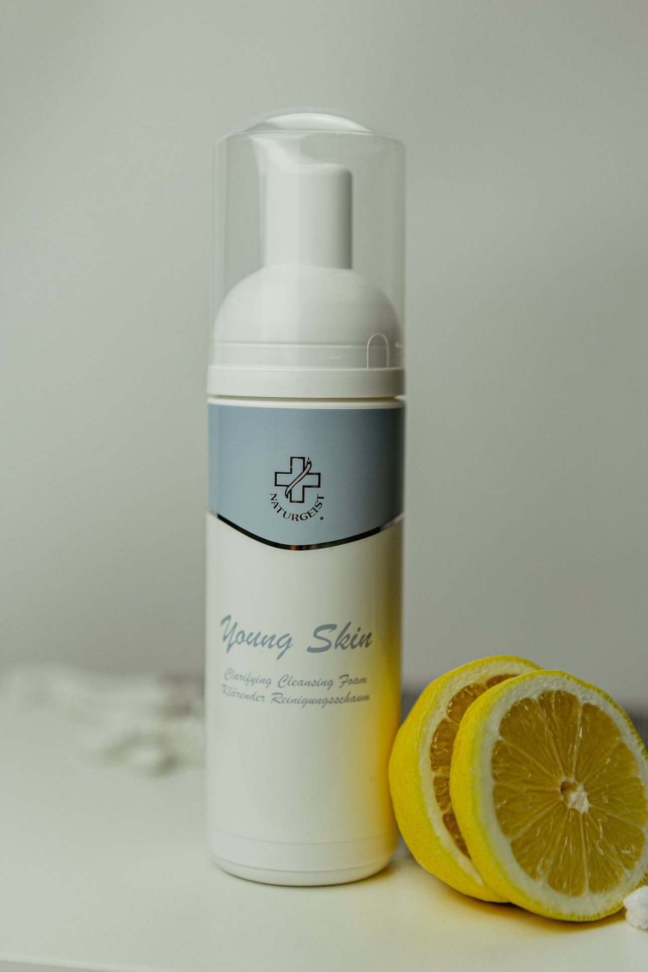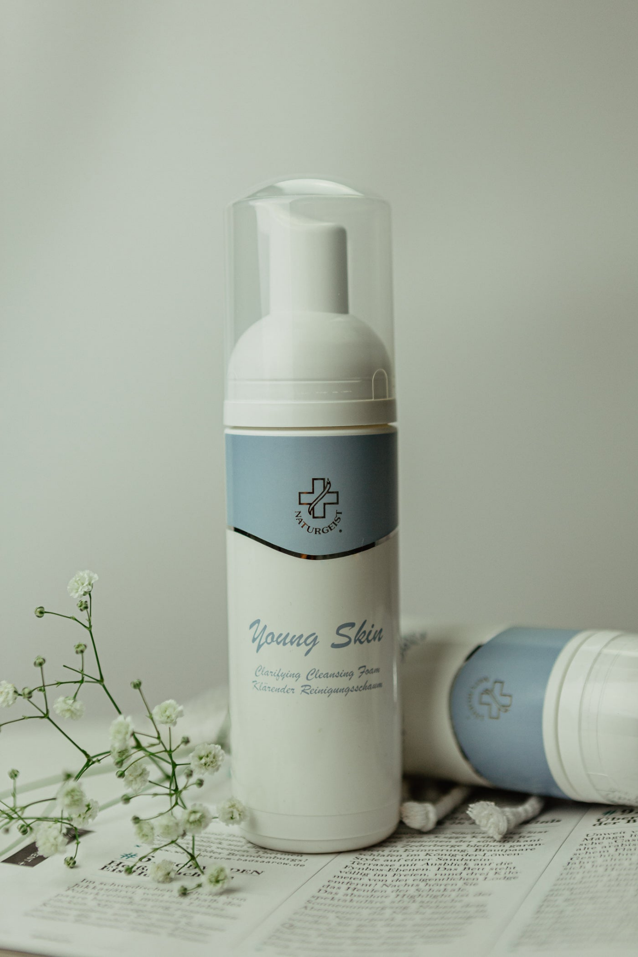Humidifiez le visage et appliquez la mousse nettoyante. Répartir le produit sur le visage par des mouvements circulaires du bout des doigts et dissoudre les impuretés. Rincez ensuite abondamment à l'eau claire et tiède. Appliquez ensuite le tonique facial clarifiant Young Skin, le roll-on et la crème.